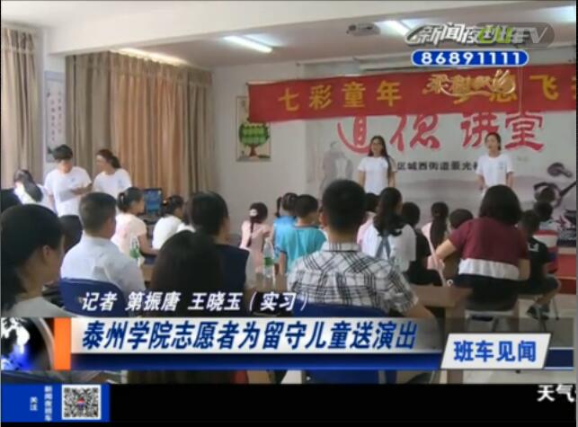 泰州电视台《新闻夜班车》以《伟德体育志愿者为留守儿童送演出》为题进行了报道。留守儿童周文佳说,今天和大哥哥大姐姐们一起上台表演,把这些天排练的努力成果表现出来,我觉得很自豪很开心。公司志愿者、暑期社会实践小分队成员、吉他手周海燕说:这是我们几天以来互相配合、默契的成果,本来我在台上是很紧张的,但是听到小朋友们稚嫩的童声附和着我,我感觉到了勇气、感觉到了力量,小朋友们给了我很大的快乐。