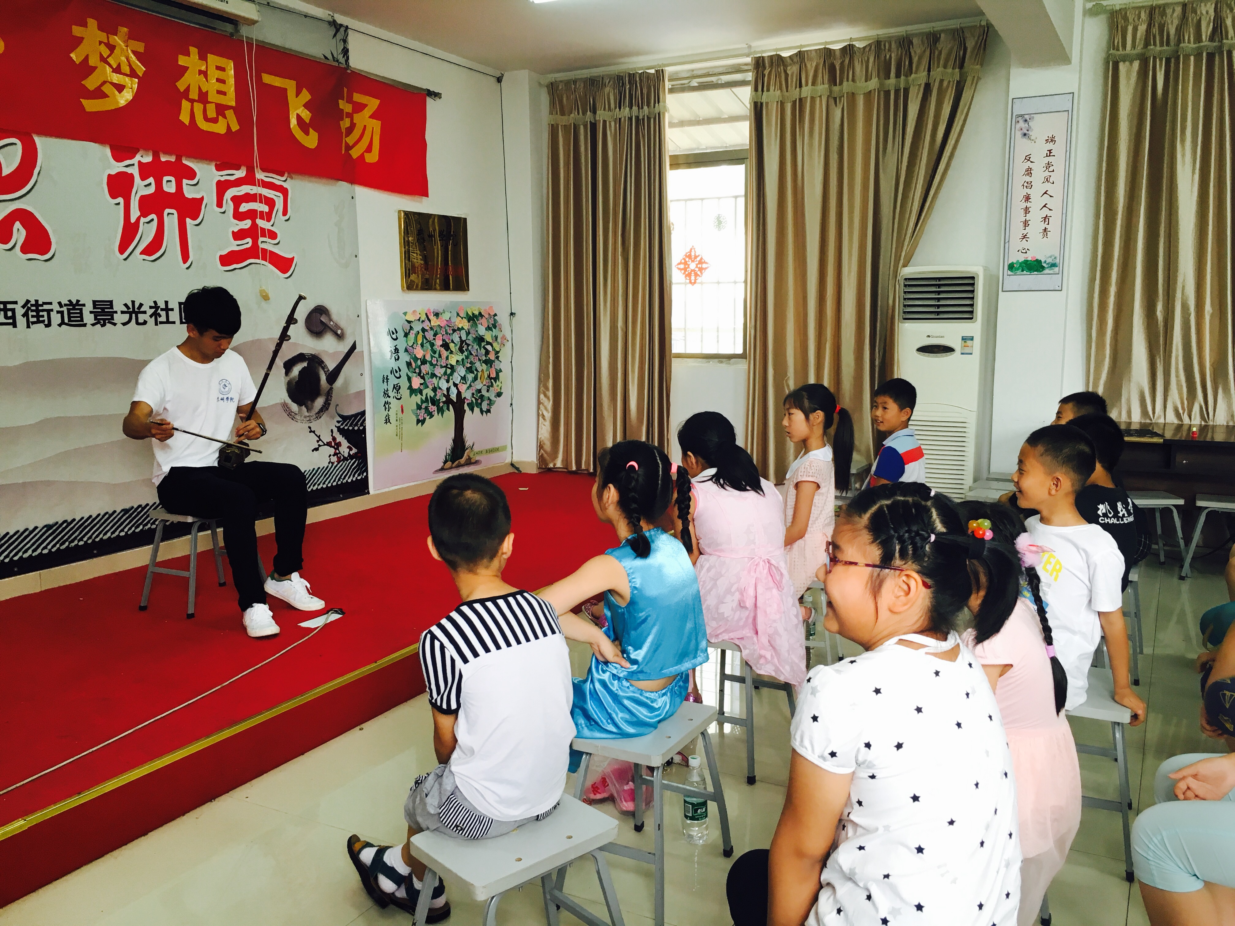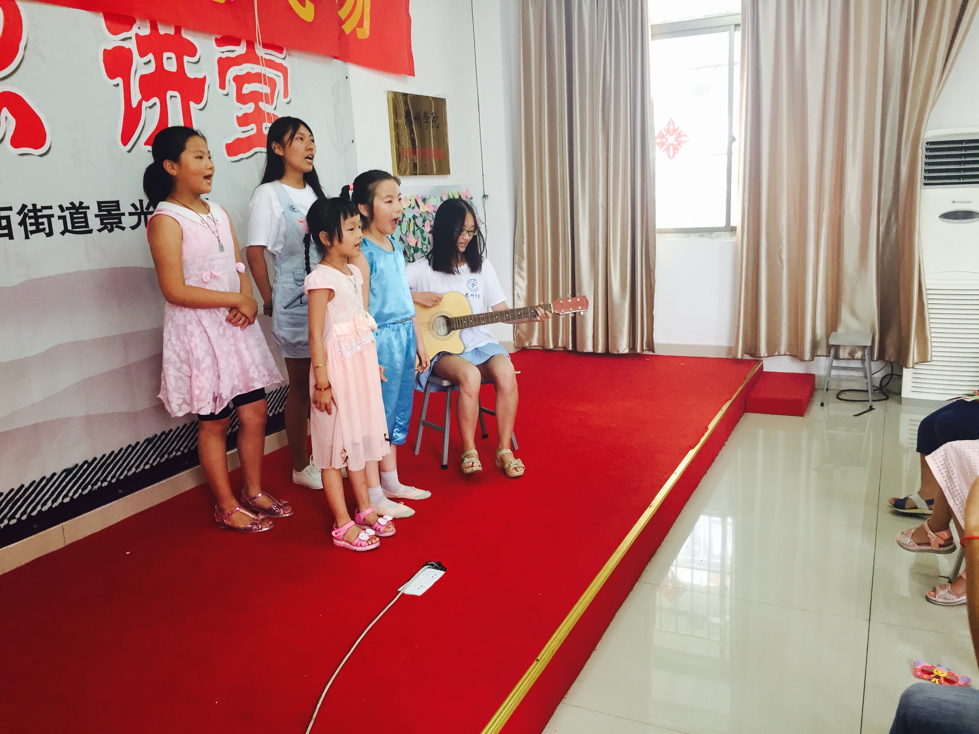 “七彩童年  梦想飞扬”主题表演,回顾了七月以来,公司志愿者带领儿童逐梦想、学交友、讲孝道的全过程。老员工志愿者带领孩子们表演了歌曲《燕归巢》、歌舞《蓝天白云跟我来》、歌舞《我不上你的当》、歌曲《当你》、吉他弹唱《童年》、朗诵《童年 幻世纪》、二胡独奏《赛马》、歌曲《热雪》等精彩节目。现场还采访了制作刮画、军事模型和泥塑的孩子们。除了精彩的表演外,志愿者们还跟孩子们一起体验了“五毛与一块”、“数字炸弹”等游戏,欢快的音乐、有趣的游戏,让不少孩子们露出笑脸。