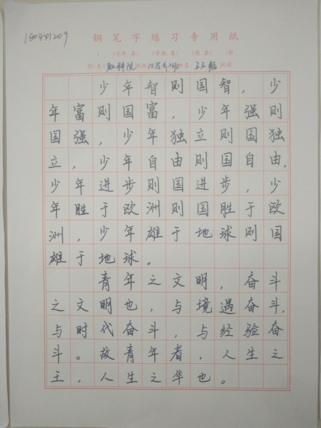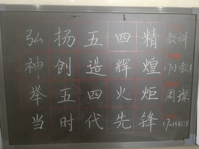 硬笔字展览在济川校区办公楼二楼中厅举行,分钢笔字展和粉笔字展。 18学前教育2班王文韬同学写的“少年智则国智,少年富则国富,少年强则国强,少年独立则国独立,少年自由则国自由,少年进步则国进步,少年胜于欧洲,则国胜于欧洲,少年雄于地球,则国雄于地球。”告诉我们应树立民族自尊心和自信心、弘扬伟大民族精神、增强热爱祖国的情感和振兴祖国的责任感。17小学教育1班周璀同学希望青年们能高举五四精神旗帜,当时代先锋,为新时代中国特色社会主义建设做出贡献。