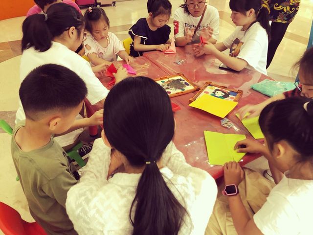 7月2日上午,团队一行14个同学带着折纸活动的必须工具:彩纸,剪刀,胶水等走进许郑社区,进入社区后,小朋友们有些害羞,有的对她们手上的工具充满好奇,志愿者们便分散在他们周围,与小朋友们聊聊天,熟知他们的兴趣爱好等基本情况后,将彩纸交给小朋友们。他们有的跟随志愿者按部就班的行动,眼睛圆溜溜的盯着志愿者们灵巧的手,有不会的地方,及时向志愿者哥哥姐姐们提出疑问。有的则发挥自己的想象,小小年纪的动手能力却不容小觑。环视四周,只见小朋友们和我们的志愿者们个个都十分投入的坐在小板凳上,将彩纸平铺在桌面上,一齐构造着自己喜欢的图案。有的折了纸飞机,有的折了小青蛙,竟还有小朋友在志愿者同学的帮助下完成了最困难的玫瑰花折叠-,投入的时间总是过的快乐而又精彩,大家其乐融融,渐入佳境,一不小心,时间溜到了中午,窗外有阳光这进教室,小朋友们的脸上也都洋溢着阳光般的笑容,空气里也弥漫了阳光的温暖的味道。