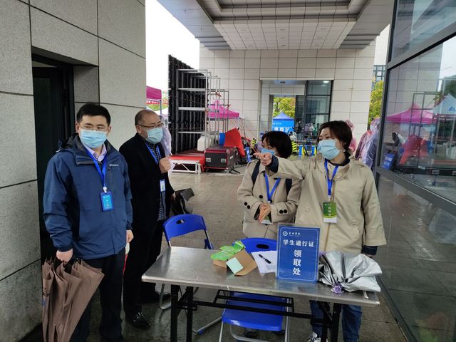 正值谷雨时节,天气寒冷却阻挡不了老师和同学们返校的热切愿望。早晨七点,辅导员汤静老师穿着防护服,佩戴护目镜和口罩在公司北门等候返校的同学,仔细核查同学的动态二维码和身份证件,核验身份。查核身份后,同学们进入测温区进行体温测量,体温正常者来到徐慧老师和李执芬老师所在的问询处领取通行证,然后前往宿舍进行二次体温测量,正常即可返回宿舍。