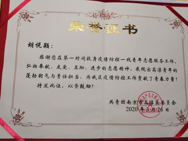 19学前教育1班胡悦颖驻守在村口的临时劝返点,为外来人员进行体温测量和信息登记等工作,积极宣传新型肺炎相关的科普知识,降低群众的心理恐慌,为村民解释疫情防控期间相关政策。为防疫工作贡献青春力量,受到地方政府的荣誉表彰。