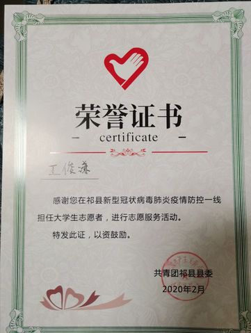 19小学教育2班柏雨琦在疫情期间驻扎在地方政府卡口和加油站卡口进行身份核实登记、体温测量等工作。除此之外,她还对外地返乡人员进行信息登记,对那些违反相关规定的人员进行劝导工作,被地方政府评为“疫情防控优秀志愿者”。
