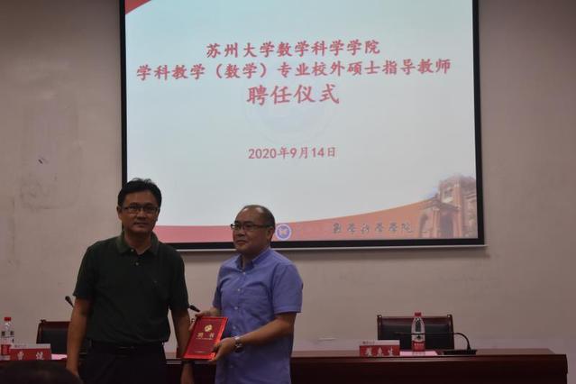 2020年9月14—15日,苏州大学数学科学公司在办公楼211学术报告厅举行了“数学教育学术研讨会及校外兼职硕士生导师聘任仪式”。苏州大学研究生院经理曹建教授,苏州大学数学科学公司经理张影教授,副经理季利均教授和翟惠生教授出席会议。公司经理程广文教授应邀参加会议,并被聘为校外兼职硕士研究生指导教师。
