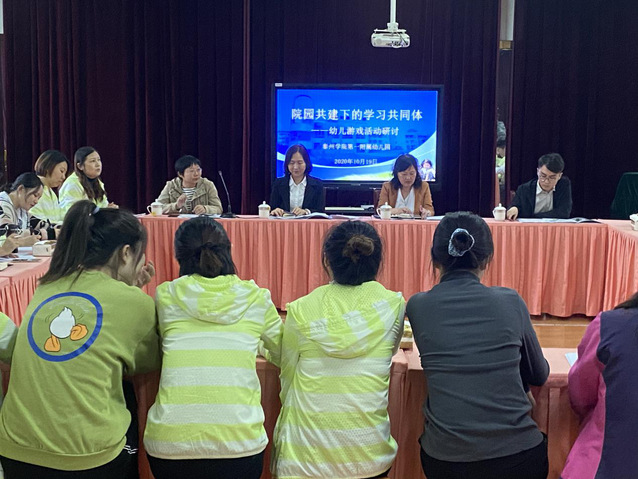在附属幼儿园园长叶伟红的陪同下,一行人观摩了幼儿在户外游戏实训区的攀爬架、树屋、大型滑索等场地的活动情况,了解了各设备的使用价值和相关注意事项。该实训区是公司设于附属幼儿园的实训场所之一,占地面积约2000余平方米,为学前教育专业员工游戏观察与指导能力的提升服务。随后,徐鸿、陈文青、王敏老师分别进入小班、中班、大班观察幼儿区域游戏活动。观察结束后,一行人与幼儿园全体教师在会议室展开交流研讨。