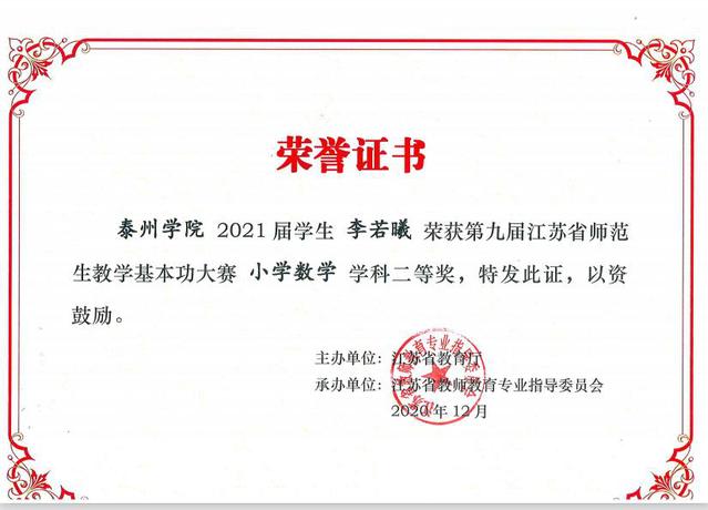 师范生教学基本功大赛是由江苏省教育厅主办,江苏教师教育专业指导委员会承办的学科竞赛之一,竞赛由通用技能与专业技能两个环节组成,是对师范生教学技能的综合评比。最终,张轶瑶同学荣获学前教育组二等奖;李若曦荣获小学数学组二等奖;凌灵、陈逸静荣获学前教育组三等奖;金愉荣获小学数学组三等奖;梁秋雨荣获小学语文组三等奖。