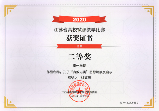 2020 年江苏省高校微课教学比赛由江苏省教育厅指导、江苏省高校微课教学比赛组委会主办,参赛对象为全省高校的专任教师。公司潘越老师报送《全语言教育理论及其在幼儿园中的应用》和姚海燕老师报送的《孔子“有教无类”思想解读及启示》均荣获二等奖。