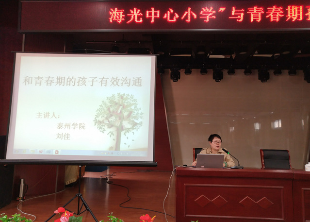 4月9日下午,国家二级心理咨询师公司副教授刘佳老师在泰州市海光中心小学开展“与青春期孩子的有效沟通”的专题讲座,三百余名家长参加。