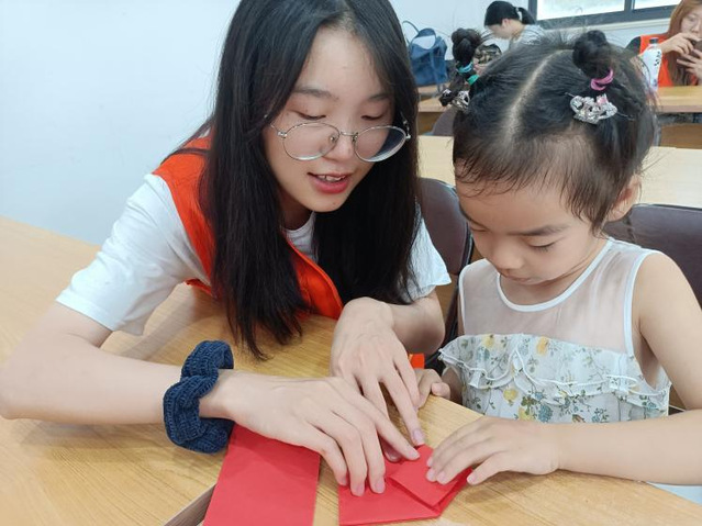 团队志愿者手把手教孩子们折纸,小朋友们跃跃欲试,一拿到折纸就迫不及待地操作起来。在志愿者耐心的教导下,一压一叠,一翻一折,小朋友们很快便折出丰富多彩的作品。一个个色彩斑斓的折纸爱心,汇集成一个大爱心,以表达着对国家、对党的热爱之心。一艘艘漂亮的小红船,承载着每一个人的祝福,带领人们驶向更美好的未来。一位小朋友高高举起自己的作品向大家展示,显得神采飞扬:“你们看,我不仅折叠了一只属于自己的红船作品,而且还会折了各样的爱心,你们看我折的好不好!”在折纸活动中,志愿者引导小朋友们用大脑去思考,用双手去创造,用心灵去感受,制造出一份份形式新颖的作品,向党的百年华诞献上一份独特的礼物!指尖舞动的是孩子们对折纸艺术的热爱之情,是小朋友们对祖国的一片赤忱之心。大手与小手,共同见证红色基因的薪火相传,红色折纸翻转,描绘着百年辉煌的时代篇章。