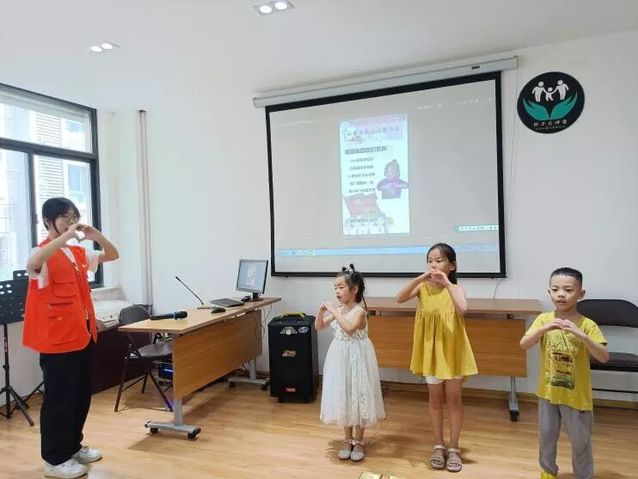 志愿者先让小朋友们欣赏《祖国祖国我们爱你》的歌曲视频,做到熟悉旋律及部分歌词,再一句一句地教授歌词,并巧妙地运用手势舞动作来加深小朋友们对歌词的理解和记忆。孩子们在志愿者的教授下很快学会了这首歌曲,一个个高高举着手,争着想要上台展示学习的成果。在最后全体展示环节,小朋友们将那浓浓的爱国心化为铿锵有力的语言,用稚嫩清脆的美妙童音,唱出了对中国共产党的衷心拥护,唱出了一心跟党走的坚定信念,唱出了对党和祖国的无限热爱。学完这首歌,有位小朋友们还不尽兴,说道:“我还会唱《我和我的祖国》,这是我们小学合唱的歌曲”,于是在小朋友的独唱中,童声歌颂的课程告一段落。
