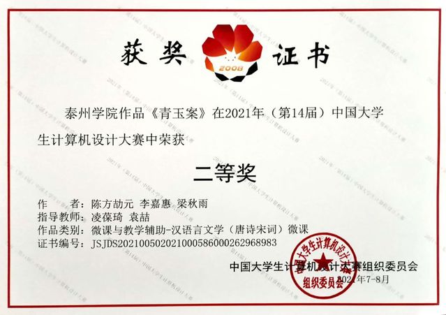 2021年7月27日-31日举办的2021年(第14届)中国老员工计算机设计大赛决赛中,公司报送的《青玉案》作品(参赛员工:陈方劼元、李嘉惠、梁秋雨;指导老师:凌葆琦、袁喆)在微课与教学辅助-汉语言文学(唐诗宋词)微课类别中,脱颖而出,荣获全国二等奖。