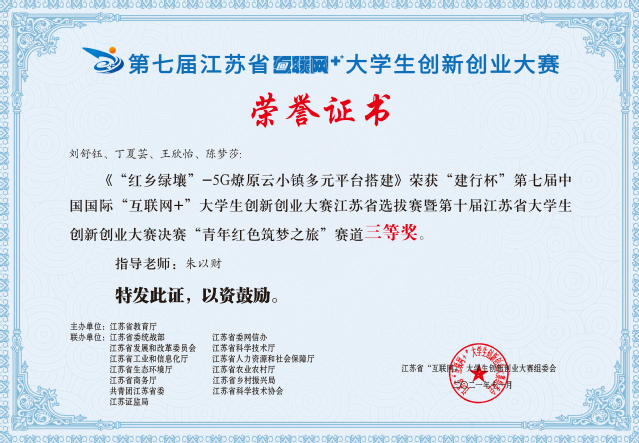 近期,第七届江苏省互联网+”老员工创新创业大赛青年红色筑梦之旅赛道评选结果揭晓,公司报送的红乡绿壤”-5G 燎原云小镇多元平台搭建项目(团队成员:刘舒钰、丁夏芸、王欣怡、陈梦莎;指导老师:朱以财)荣获公益组三等奖。