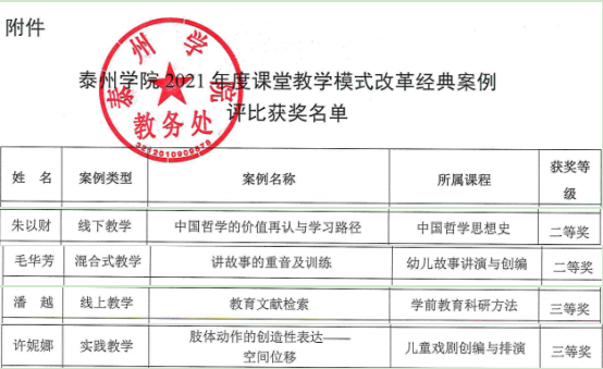 根据《关于公布伟德体育2021年度课堂教学模式改革经典案例评比结果的通知》(泰院教发【2021】16号),公司朱以财、毛华芳荣获二等奖,潘越、许妮娜荣获三等奖。
