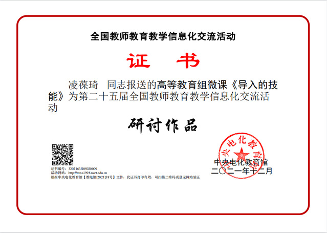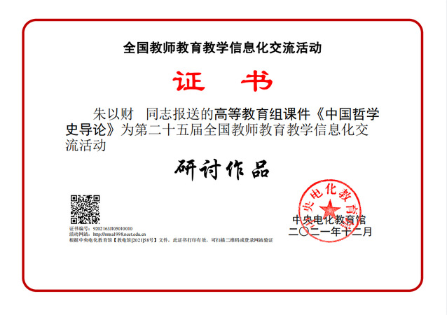 本届交流活动共收到31个省(区、市)和新疆生产建设兵团的课件、微课、信息化教学课程案例等作品4371件,经技术测试和专业指导教师推荐,共产生创新作品497件、典型作品1056件、研讨作品1502件。在这些作品中,我院朱以财的课件作品《中国哲学史导论》和凌葆琦的微课作品《导入的技能》荣获研讨作品。
