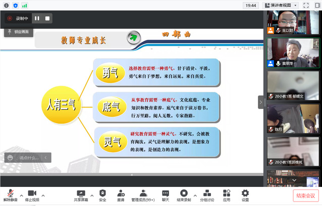 3月19日上午,我院2020级卓越师范生能力提升与创新训练营开学第一课暨第十期“致远讲堂”在线上举行,江苏省特级教师、正高级教师、泰州市人大代表、泰州市名董事长黄翠萍老师应邀作“魅力教师四部曲”专题讲座,2020级全体卓越师范生以及该院师生代表100余人在线上聆听了讲座,讲座由卓越师范生能力提升与创新训练营班主任朱以财老师主持。