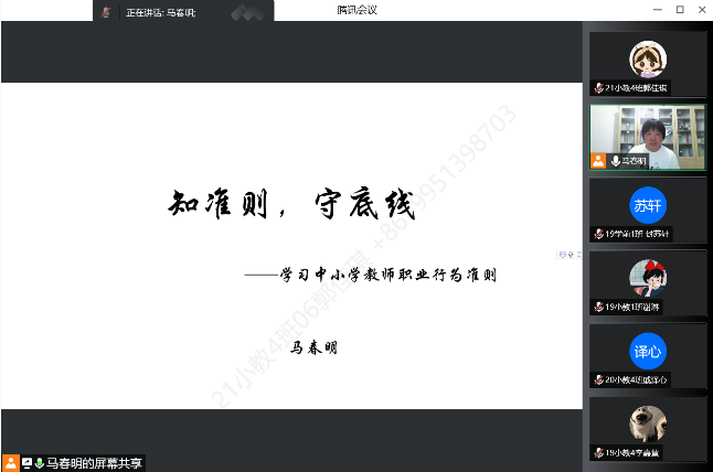 马春明以“知准则,守底线”为主题,带领员工认真学习了新时代教师职业行为十项准则。她强调,同学们在教育实习过程中牢记老师和员工的双重身份,坚守教师师德师风底线,争做“四有好老师”。