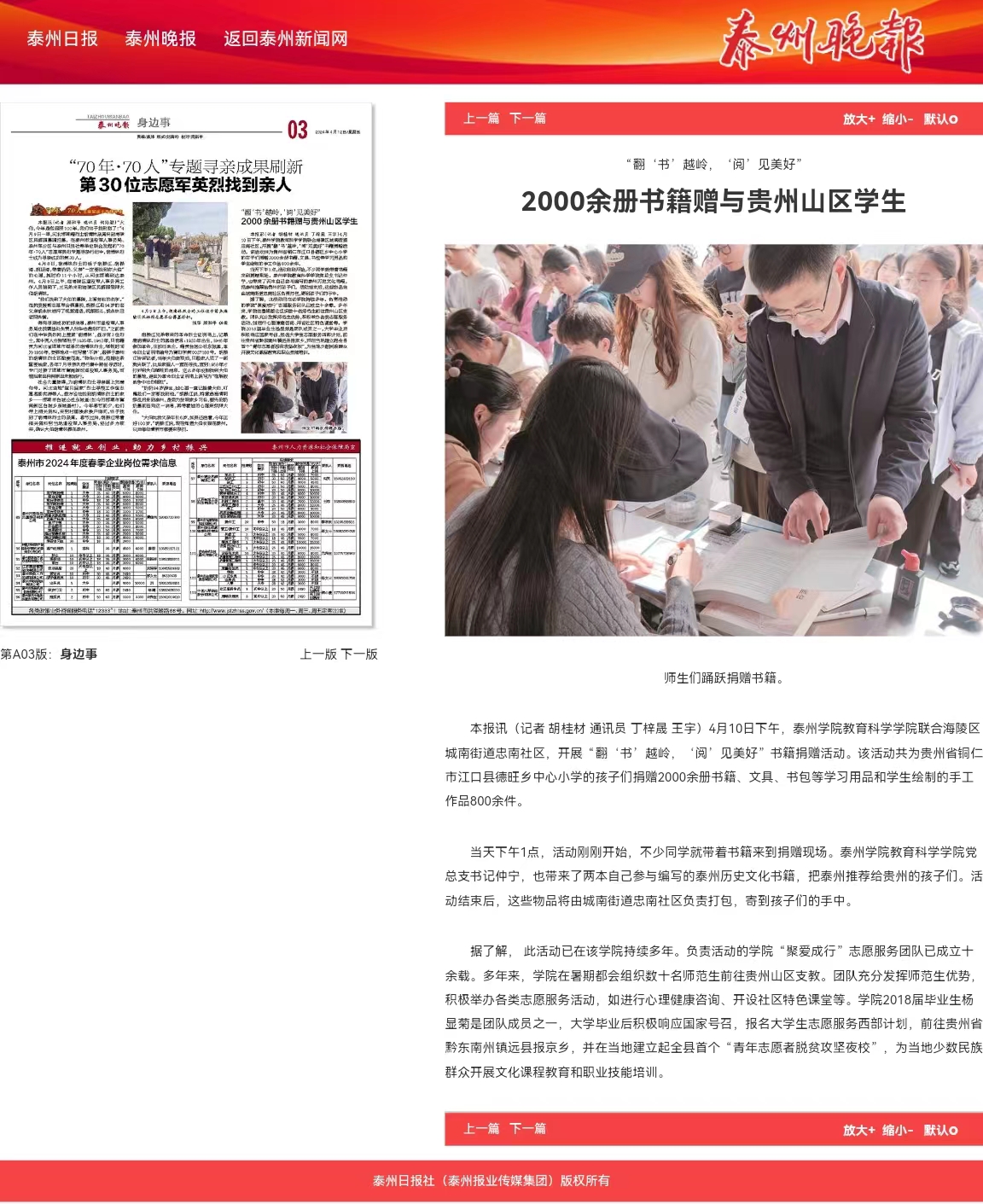 2024年4月12日,《泰州晚报》报道伟德bevictor开展的伟德bevictor开展的“ 翻‘书’越岭,‘阅’见美好”书籍捐赠活动,报道链接:https://jhd.xhby.net/share-webui/detail/s6618e0dfe4b0a2749b87142f