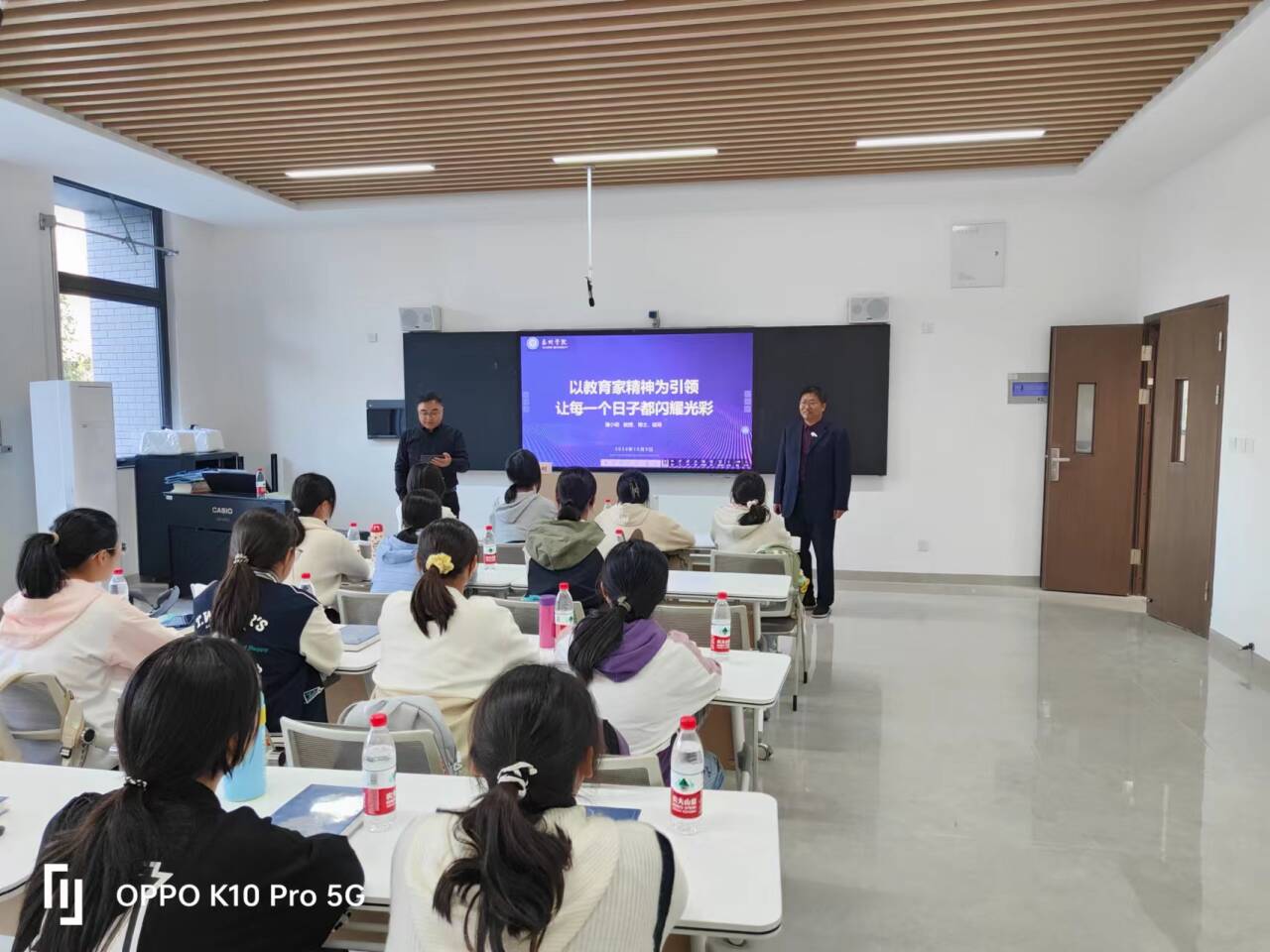 开学式还特别设置了赠书环节与会嘉宾每一位定向师范生赠送教育类著作为了教育的明天》开学式结束后,潘小明教授为18名定向师范生作了题为《以教育家精神为引领让每一个日子都闪耀光彩》的专题讲座,从“新时代教育家精神的基本内涵及其生成的相关依据”“校师范生为什么要学习、 融入新时代教育家精神?”“在校师范生日常如何学习融入新时代教育家精神”等三个方面,助力同学们深化对教育的认知,进一步坚定同学们从教的决心。