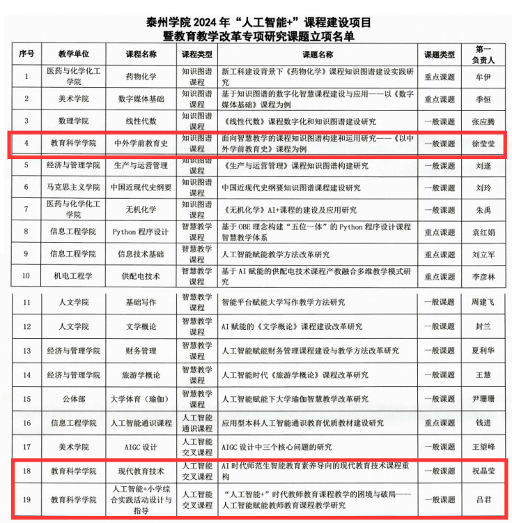 1029日,校教务处公布《关于公布伟德体育“人工智能+”课程建设项目暨公司产品改革专项研究课题遴选结果的通知》(泰院教发【202424号),公司3个项目获批校“人工智能+”课程建设项目暨公司产品改革专项研究课题