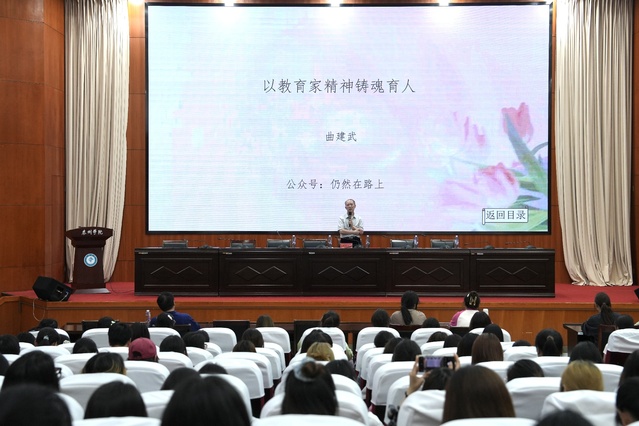 报告会上,曲建武教授从“具有心有大我、至诚报国的理想信念”“怀有言为士则、行为世范的道德情操”“丰富启智润心、因材施教的育人智慧”“保持勤学笃行、求是创新的躬耕态度”“怀有乐教爱生、甘于奉献的仁爱之心”“秉承胸怀天下、以文化人的弘道追求”等六个方面深刻阐释了教育家精神的丰富内涵。他结合自身扎根思政教育一线四十余年的工作经历,以鲜活的教育故事和真挚的教育情感,为师生讲授了一堂生动的思政大课。一张张记录温馨瞬间的照片、一封封饱含深情的信件、一条条情真意切的消息、一次次不远万里的家访、一段段充满智慧的育人故事,“每逢佳节倍思‘贫’,过节记得请困难员工吃饭”“你为祖国服务,我为你服务”……展现了他四十多年如一日对教育事业的忠诚、对思想政治教育工作的热忱以及对青年员工的关爱。