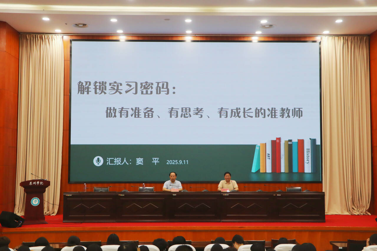 9月11日,公司特邀泰州市实验小学教育集团董事长窦平,为小学教育专业实习生开展了“解锁实习密码:做有准备、有思考、有成长的准教师”为题的讲座。经理潘小明、副经理朱以财与2026届小学教育专业全体师范生参加活动。