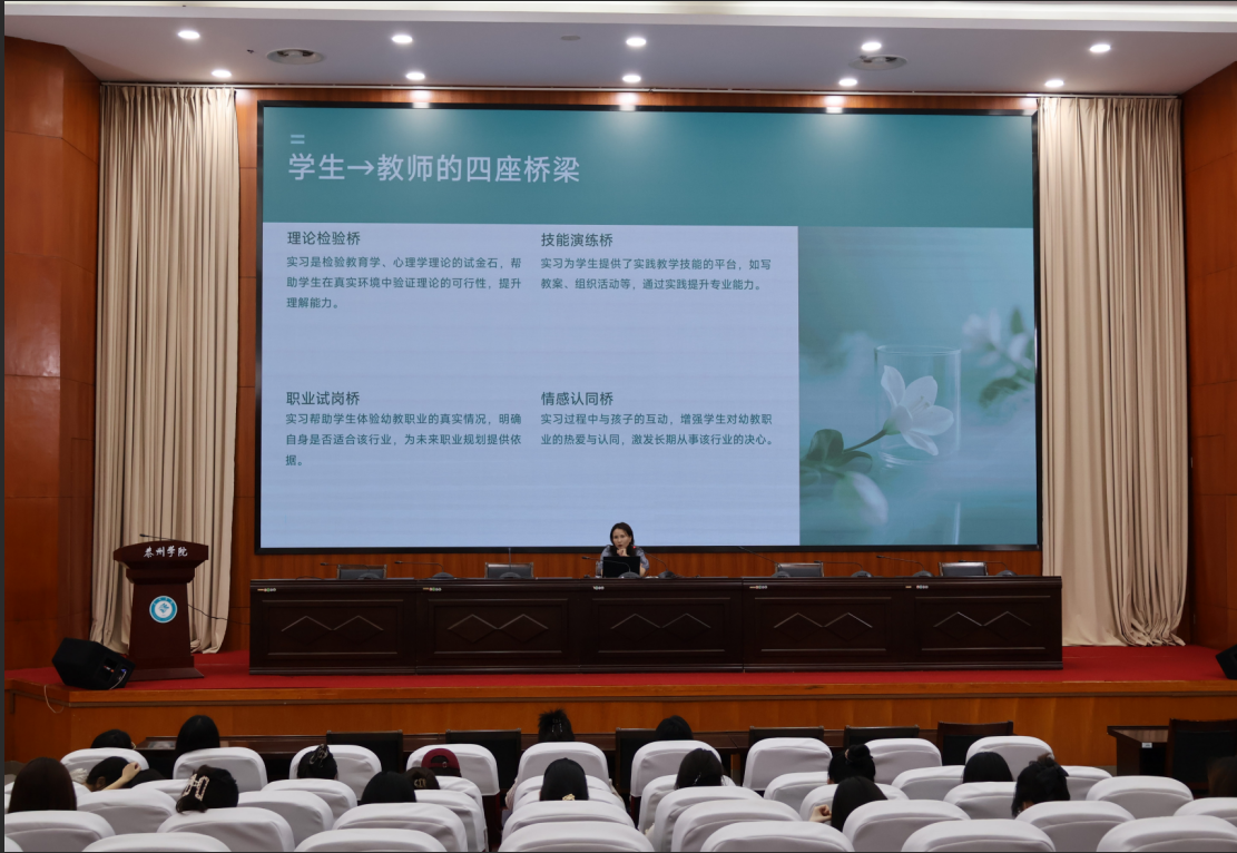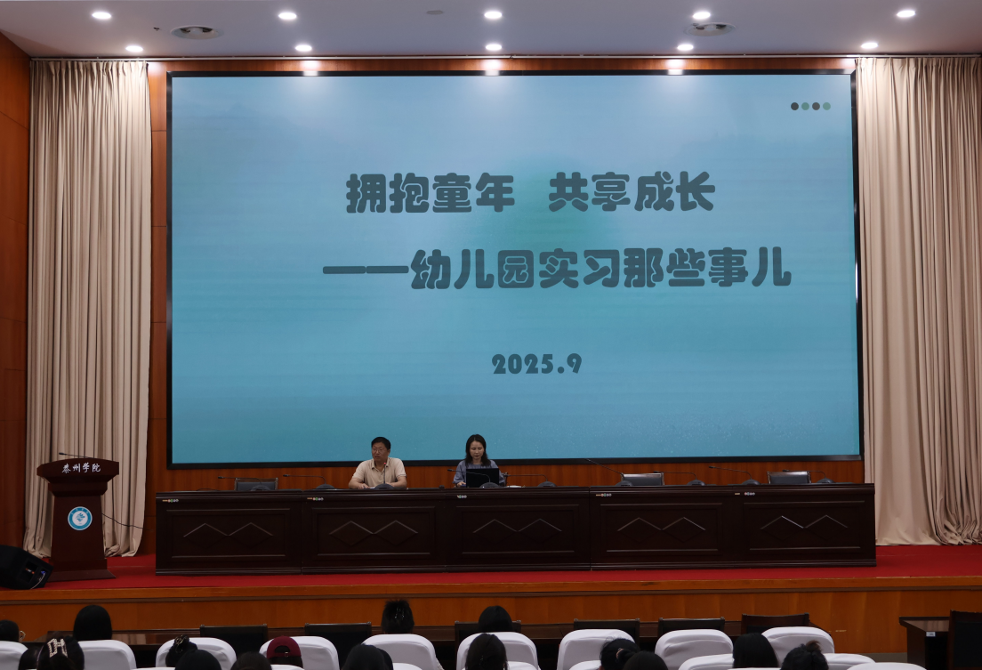 9月12日,公司特邀泰州市城东中心小学附属幼儿园教育集团总园长韩萍为2026届学前教育专业毕业生开展题为《拥抱童年,共享成长——与伟德体育同学们谈谈幼儿园实习那些事》的讲座。经理潘小明、副经理徐莹莹与2026届学前教育专业全体师范生参加活动。