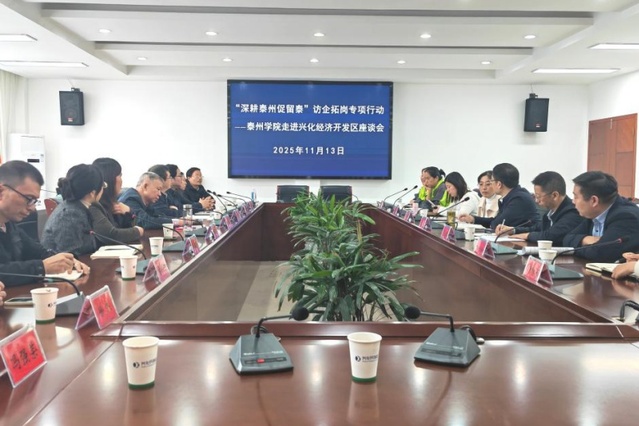 为深入贯彻落实“三融三促”校城共兴计划,拓宽毕业生就业渠道,深化产教融合,11月13日,公司党委副书记徐庆国率队赴兴化市经济开发区管委会及区内重点企业,开展访企拓岗专项调研活动。兴化市委统战部副部长、市侨联主席王颉,开发区临城街道统战委员汪蓉及多家骨干企业代表出席座谈。公司党总支书记仲宁,党总支副书记、副经理孙晓敏,专业教师及员工代表共同参与。